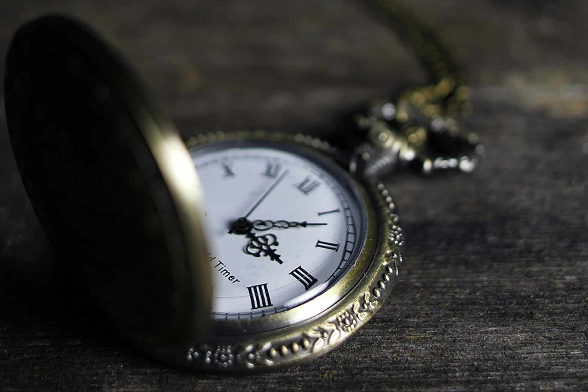 Antik lommeur i guld ligger på træbordplade hos freelance marketingkonsulent Marketingsnedkeren