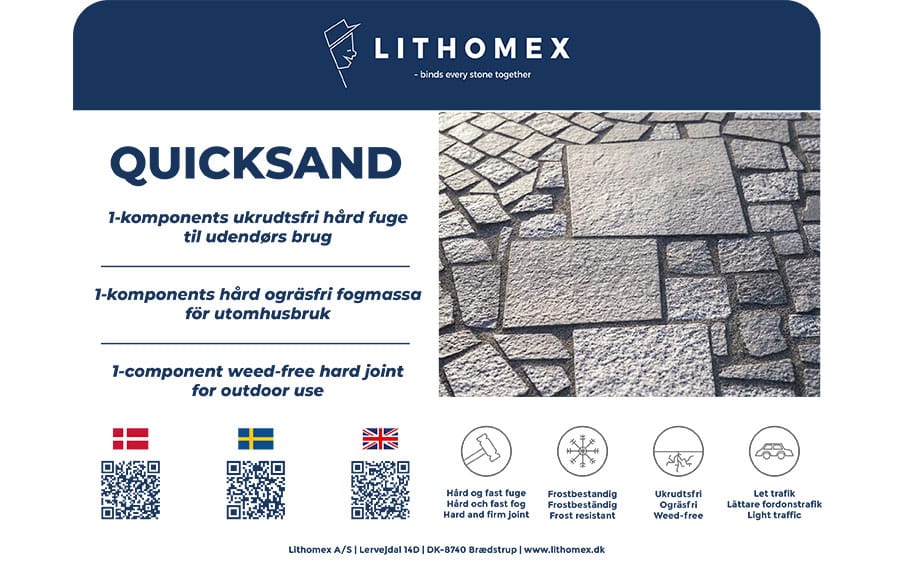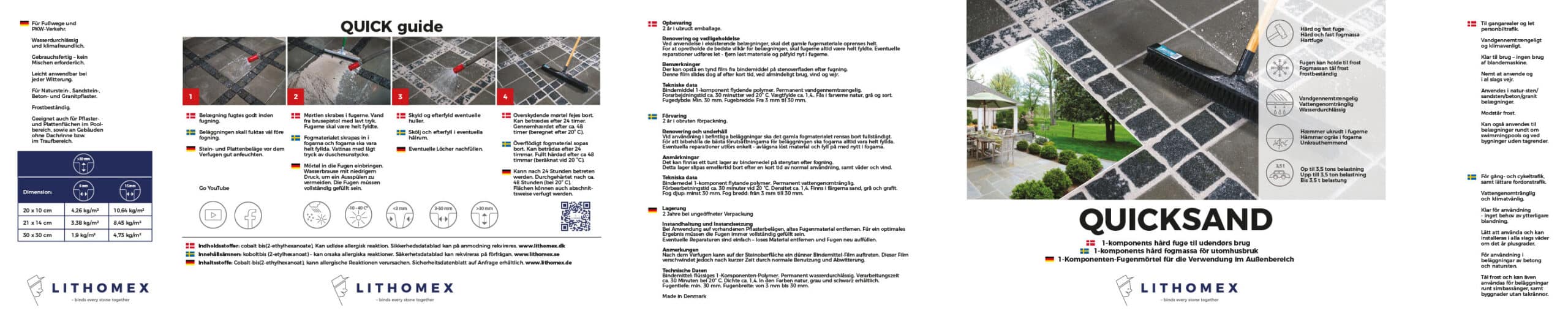 På forsiden er Ai billedet fra låget. Der er tydelige overskrifter og tekster på tre sprog samt ikoner, der fortæller om produktets fordele, QR-koder med flag linker til mere info og videoguides på websider.
